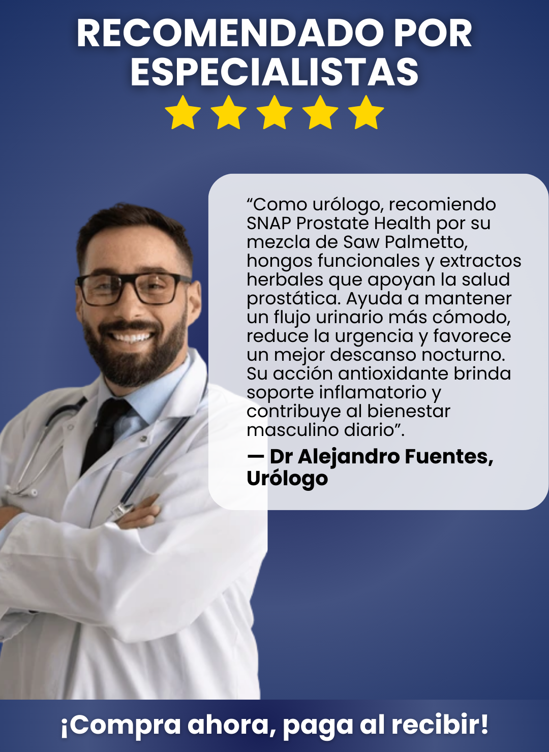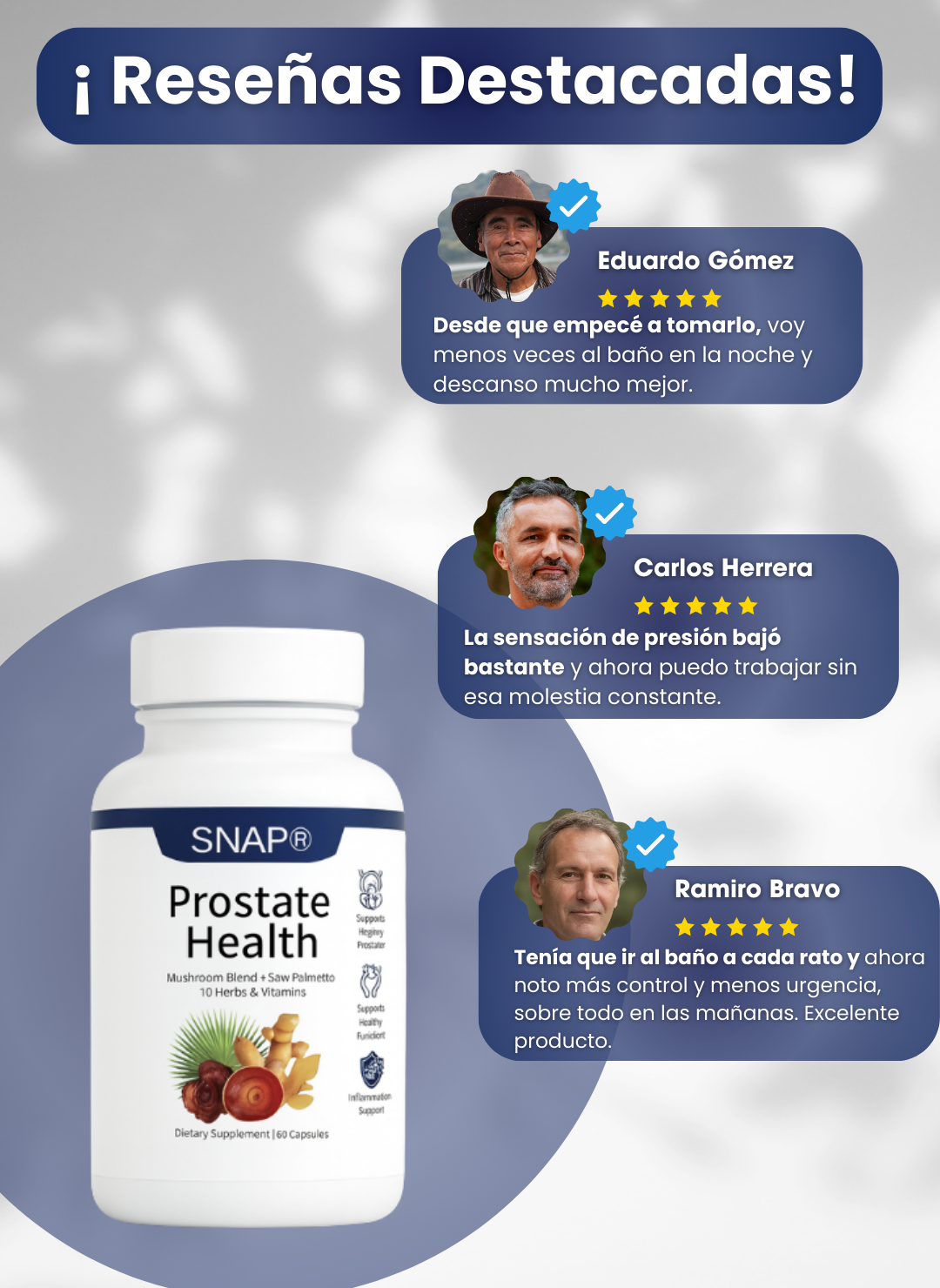Snap Prostate Health está elaborado con ingredientes botánicos conocidos por su seguridad. En general, es bien tolerado y no suele causar efectos secundarios. Aun así, si tomas medicamentos o tienes alguna condición médica, se recomienda consultar con tu médico antes de iniciar cualquier suplemento.