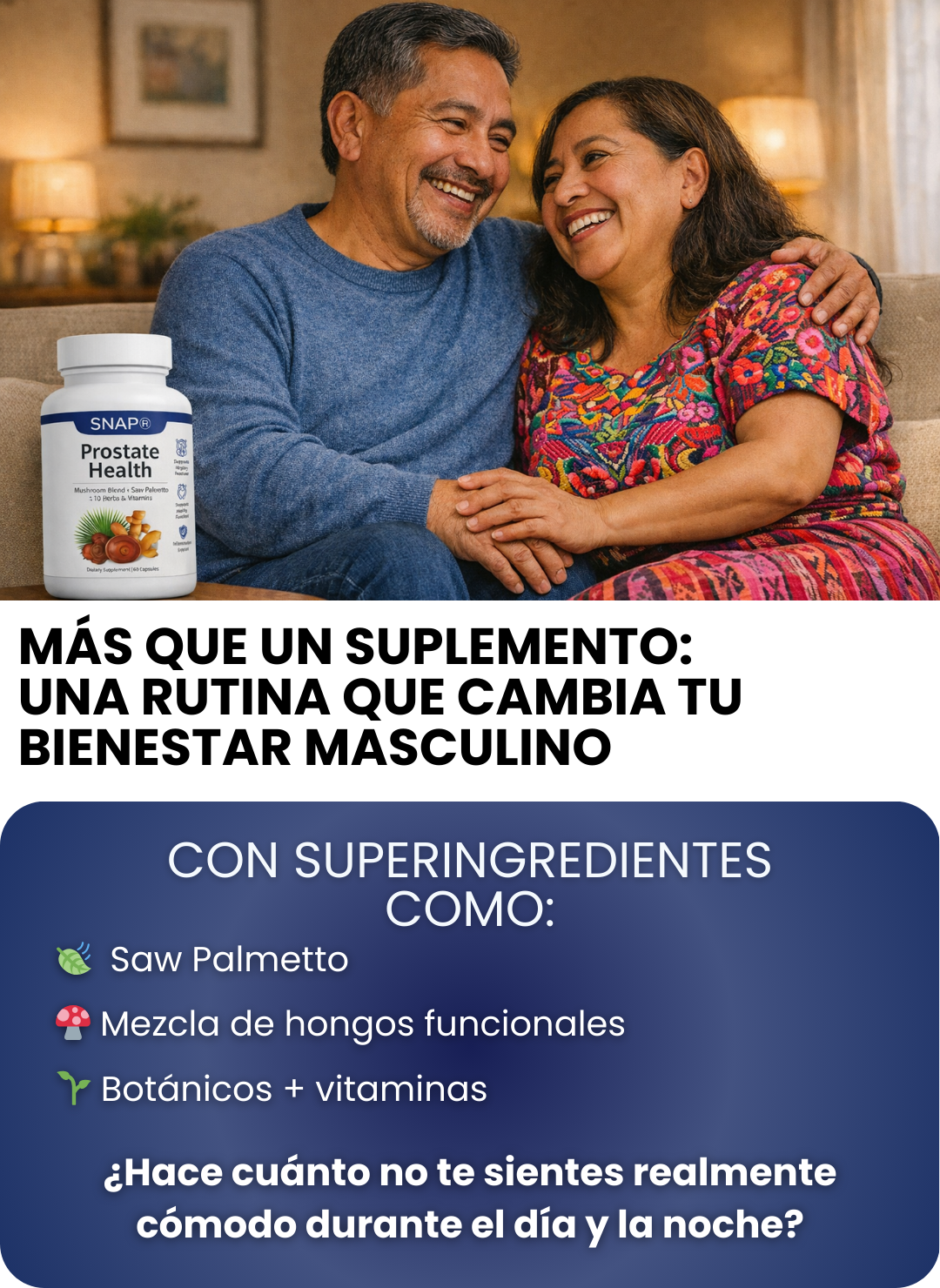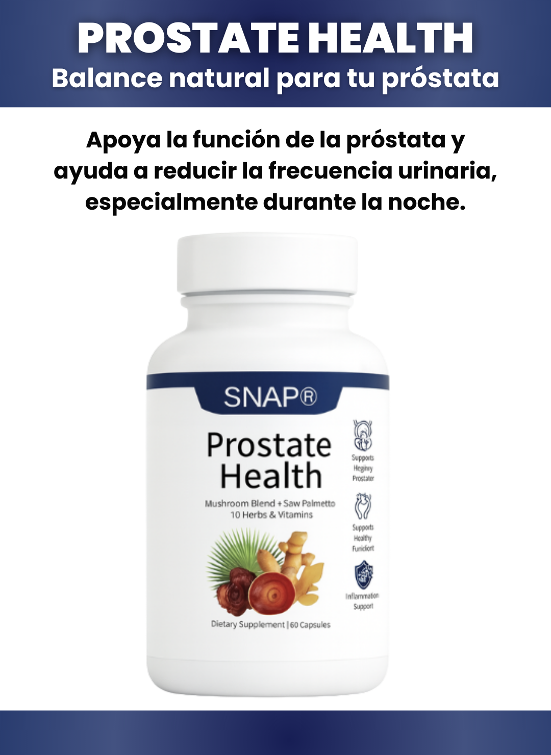 Snap Prostate Health está formulado para apoyar la salud de la próstata, mejorar el flujo urinario y reducir las visitas nocturnas al baño. Sus ingredientes botánicos ayudan a mantener el equilibrio hormonal, la función urinaria y el bienestar general del hombre.
